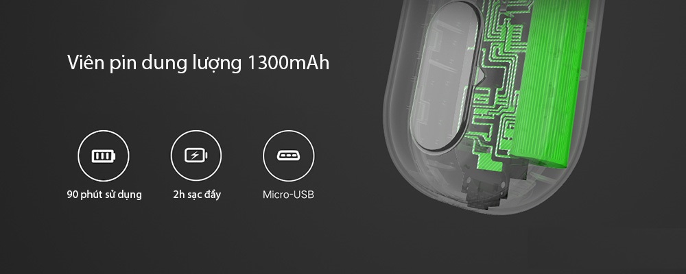 Viên pin Lithium 1300mAh cũng được trang bị trên chiếc máy cắt lông xù quần áo này. Chỉ mất 2 giờ sạc qua cổng sạc micro-USB phổ biến là người dùng đã có thể thoải mái sử dụng trong 90 phút liên tục. Rất linh hoạt trong những chuyến du lịch, công tác xứ lạnh cần sử dụng nhiều quần áo vải len, lụa dễ nổi lông xù.