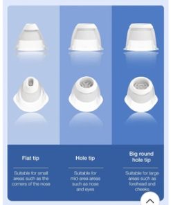 Để phù hợp với nhiều vùng khác nhau trên khuôn mặt như cánh mũi, mắt, mũi, trán, má,… nên đi kèm với máy hút mụn là 3 loại đầu hút mụn được làm từ silicon vô cùng mềm mại và dễ dàng vệ sinh sau khi sử dụng và phù hợp với các vùng khác nhau trên khuôn mặt. Cụ thể: